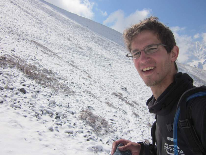 Ohne mir dessen im Vorhinein bewusst gewesen zu sein, haben wir die Grenze vom Wandern zum alpinen Bergsteigen überschritten. Wir sind nun auf gut 4300 m Höhe und ich registriere die Auswirkungen mit Unbehagen. Anzeichen von Höhenkrankheit bleiben zwar aus, aber allein die Erschöpfung zwingt mich alle 3-5 Schritte zu pausieren und tief Luft zu holen. Das Blut hämmert einem im Kopf wie nach einem 100m-Lauf und mein Trinkwasser nähert sich langsam aber sicher dem Gefrierpunkt. Die zwei Paar Socken an meinen Händen entpuppen sich (wer hätte das gedacht?) als unpraktisch und ich beschließe sie wegzulassen. Immer häufiger ziehen nun Wolken auf und mein Temperaturempfinden schwankt ständig zwischen "Sauna" und "Eisfach". Abgesehen davon, dass dadurch wieder mehr und mehr Berggipfel im Dunst verschwinden, mache ich mir auch zunehmend Gedanken über die Lage des Wetters. Als ich mich diesbezüglich jedoch an unsen Guide wende, winkt der nur ab. Während hinter uns geräuschvoll Lawinen ins Tal donnern und der Himmel sich von Blau zu Dunkelgrau verwandelt, meint er ich solle mir mal keine Sorgen machen, dreht sein Radio auf volle Lautstärke und beginnt am Steilhang zu tanzen...